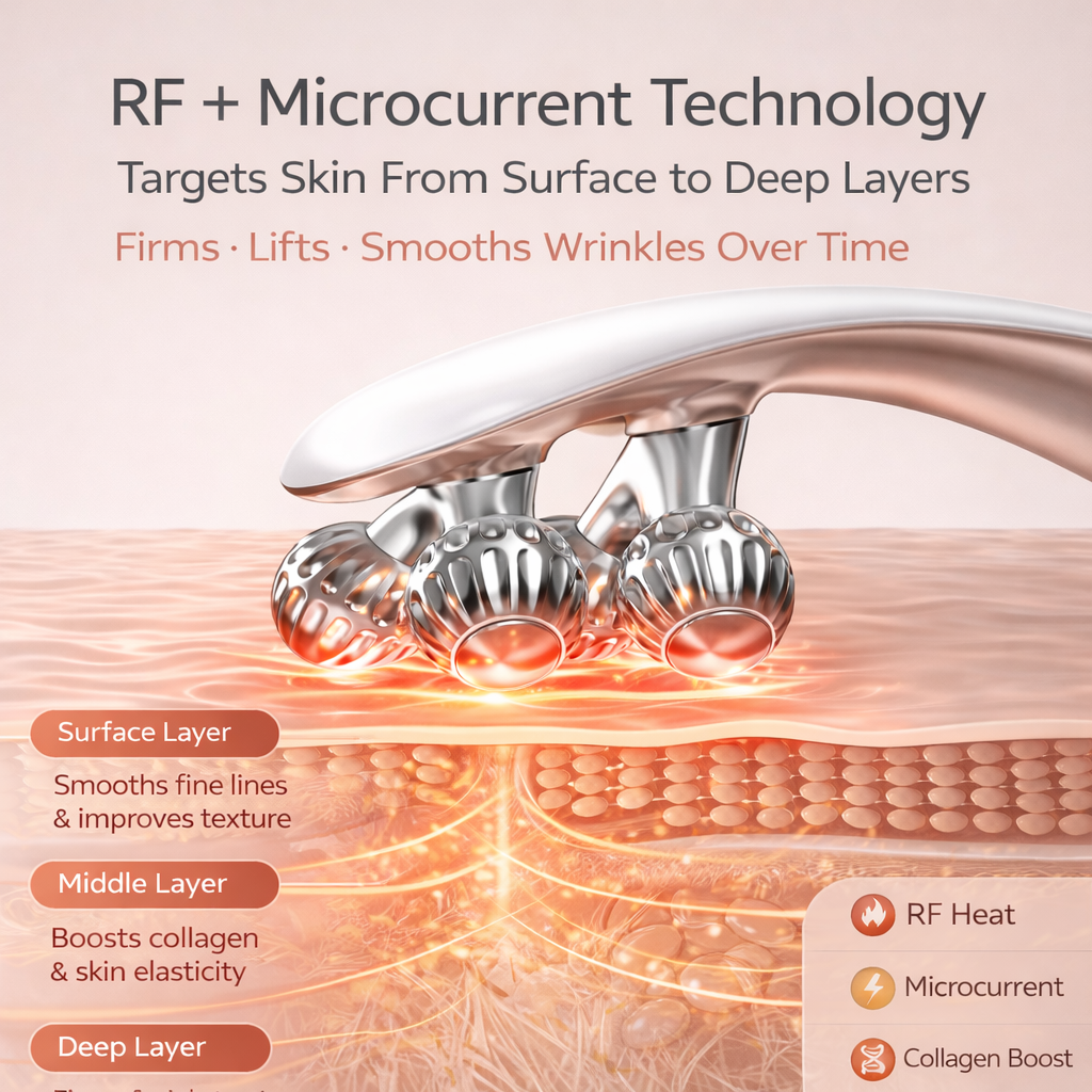 RF helps stimulate collagen production, while microcurrent activates facial muscles to support firmer, tighter-looking skin from within.